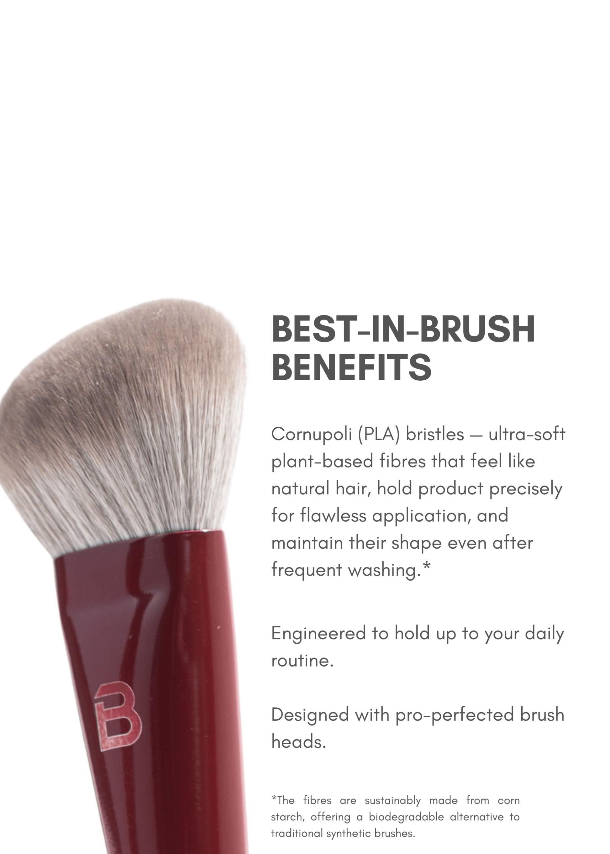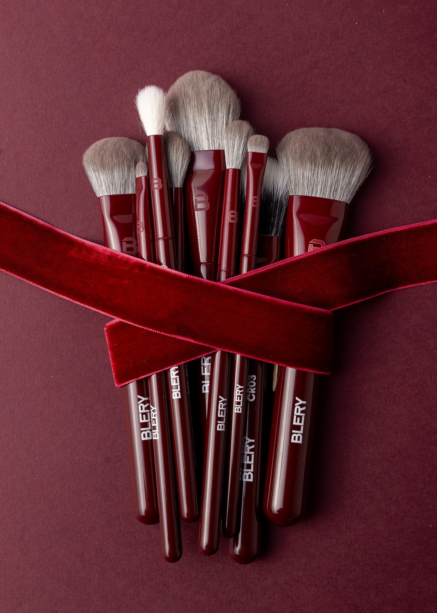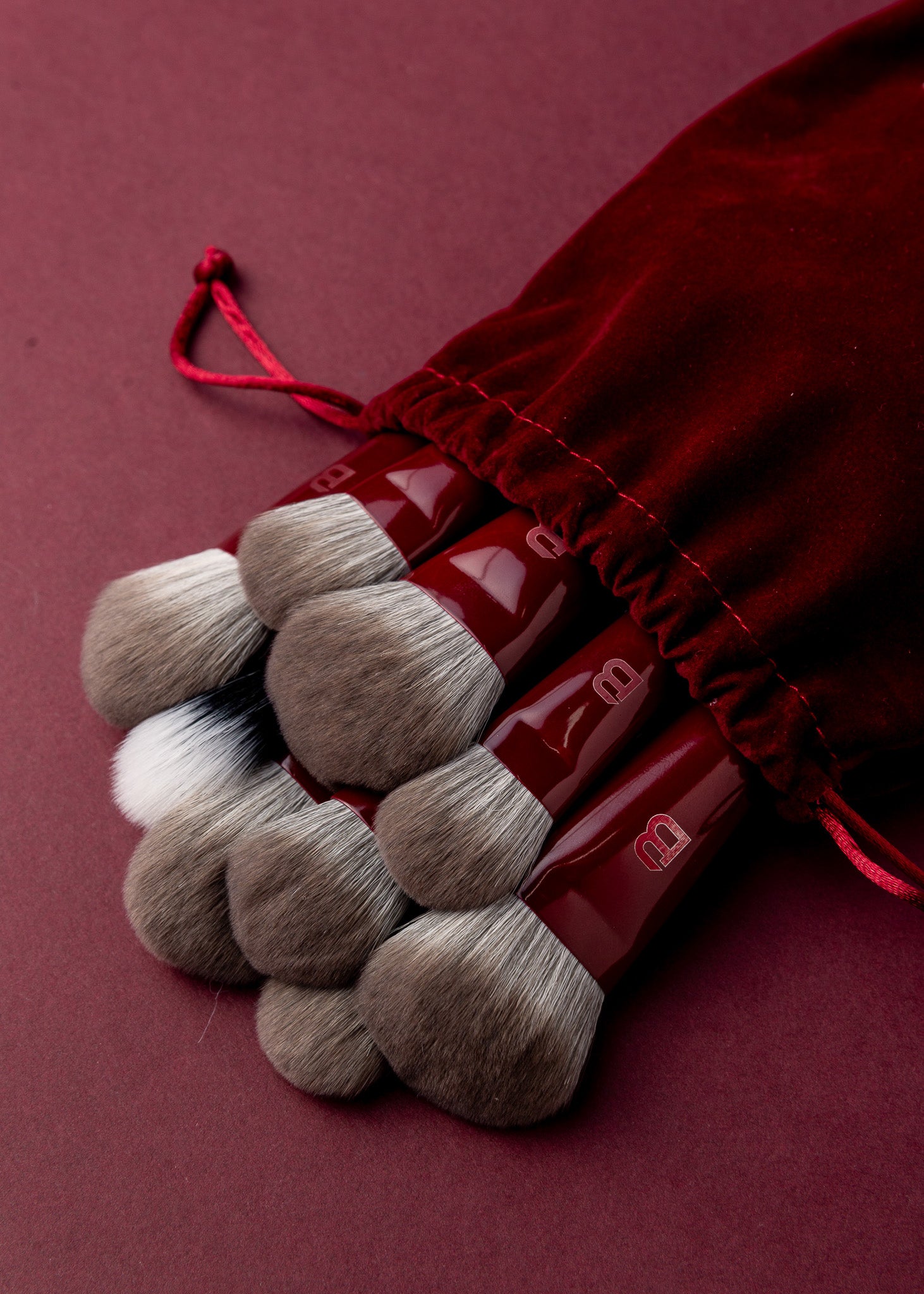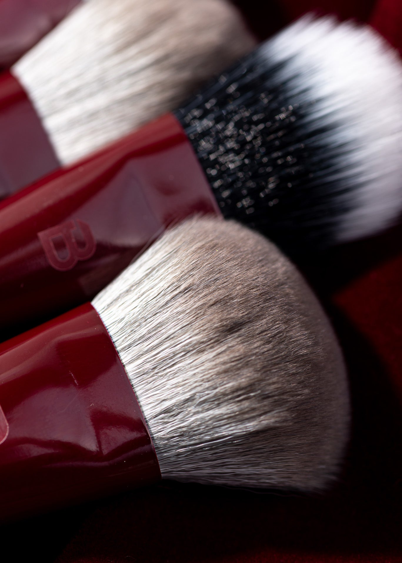Die Pinsel verfügen über einen leichten, ergonomischen Griff mit einer einzigartigen glänzenden burgunderroten Oberfläche, der auch bei langen Make-up-Sessions Komfort und präzise Kontrolle bietet. Robust und praktisch sind sie für den täglichen professionellen Einsatz konzipiert.